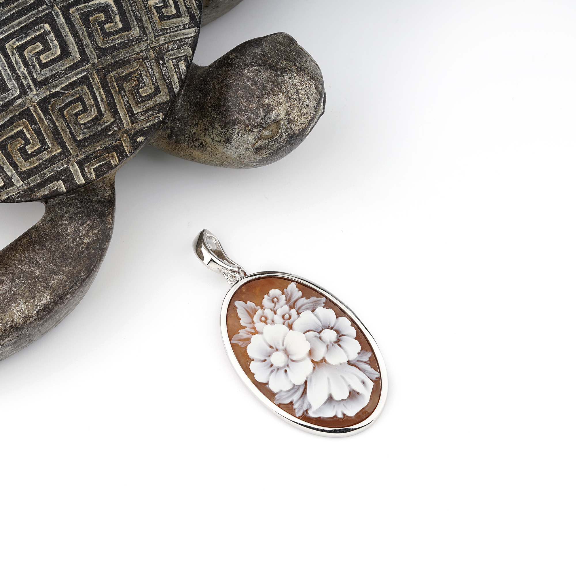 with design engraved by hand on 925 sterling silver. Cameo size 40 mm.